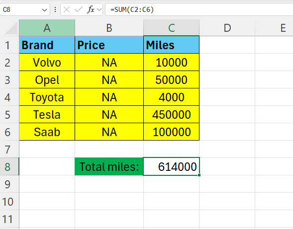 Hit ENTER – and you will see the total of the values in cell C2 to C6.