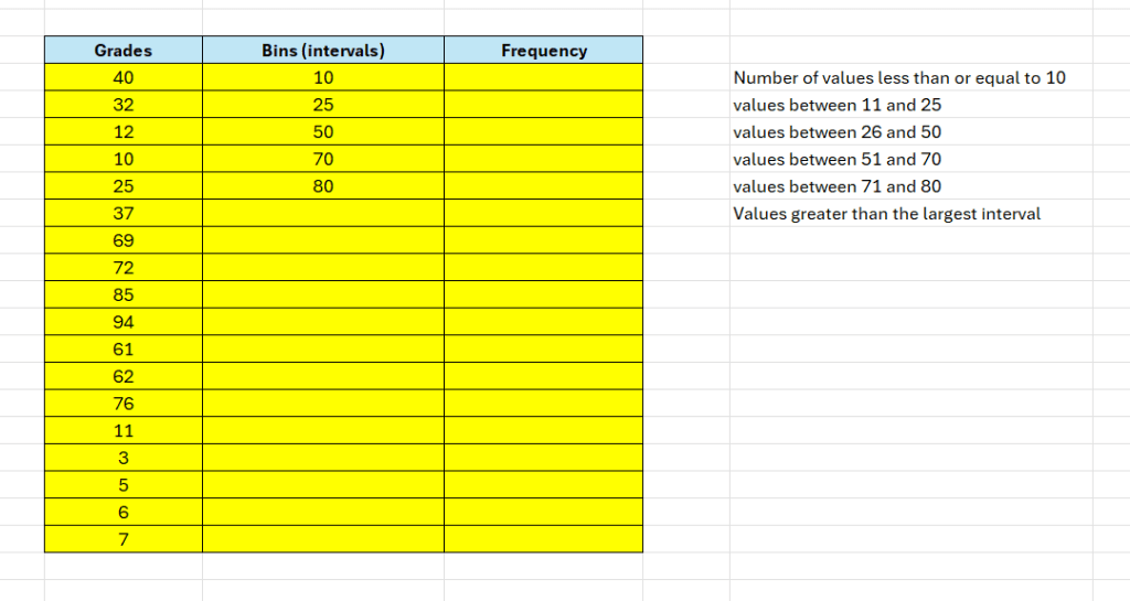 =FREQUENCY(data_array,bins_array)