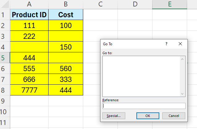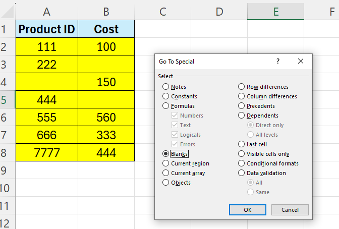 Now, select all your data – then hit F5 – this will open the Go To dialogue.