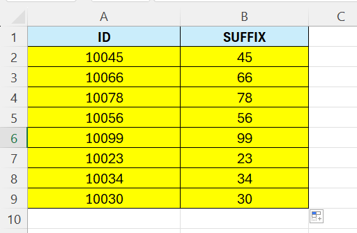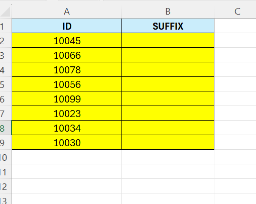 Above we have a column with some IDs – they all start with 100 – but here we want the suffix only – the last 2 characters – and put them in Column B.