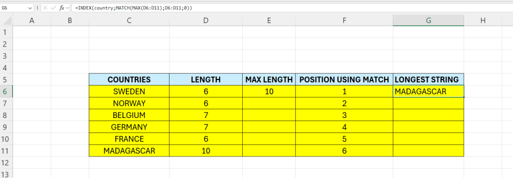 We are going to combine the LEN,MAX,INDEX,MATCH functions to get the longest string in our worksheet.