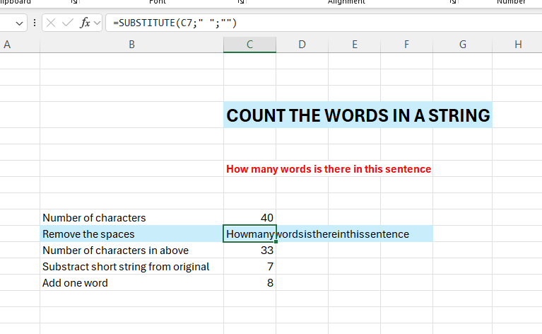 In the image below – we have our word in cell C7 – how many words is there? Well, we can easily see that it is 8.