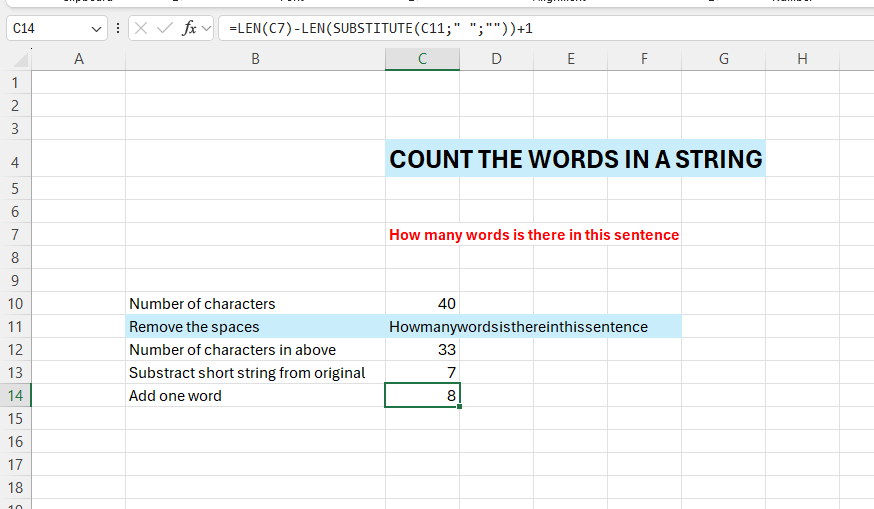 =LEN(C7)-LEN(SUBSTITUTE(C11;” “;””))
