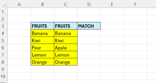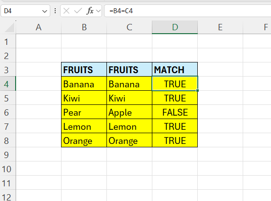 Here we check if the content in B4 is equal to the content in C4 – in this case it is TRUE.