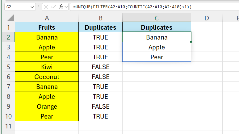 As we can see, the duplicates appear more than 1 time here as well, to get rid of those, we can use the =UNIQUE() function.