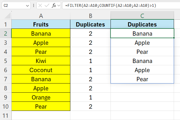 =FILTER(A2:A10;COUNTIF(A2:A10;A2:A10)>1)
