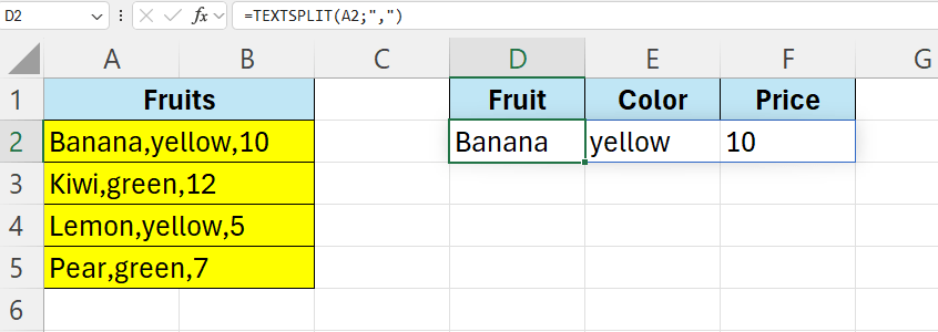 The first argument is the text, in this case A2 – the second argument is the delimeter we want to split on – in this case it is a comma.