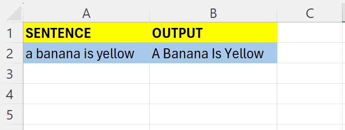 If we want every word to start with a capital letter, enter the following formula in B2: