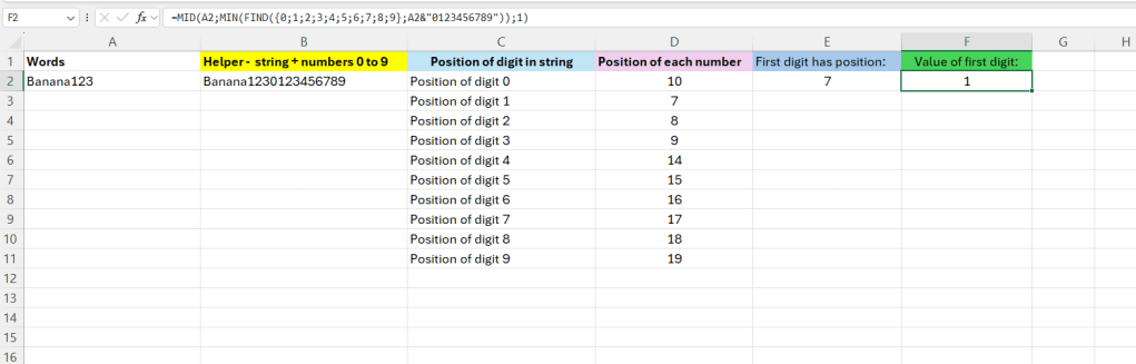 We are only interested in the first digit in the string in A2 – so we can use =MIN() to get the smallest number from column D – we can see that it is 7, position 7 that is.