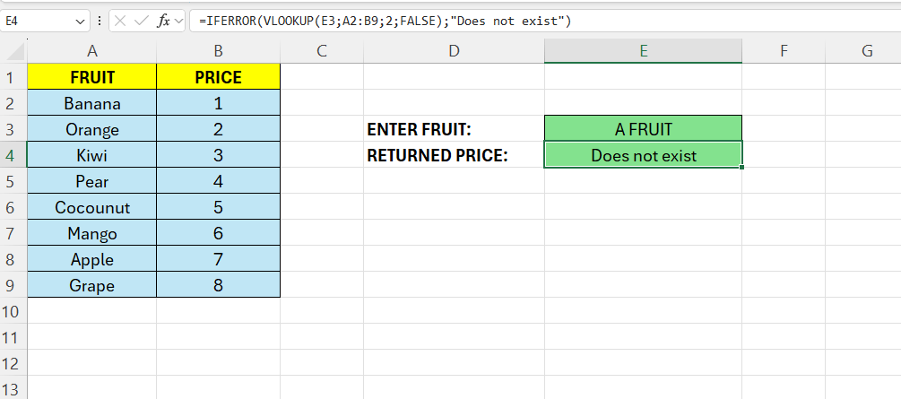 Above we have some fruits in column A, and its price in column B. We want to enter a name of a fruit in E3 and get its price in E4. As we can see above, “A FRUIT” does not exist in column A – so we get a #N/A