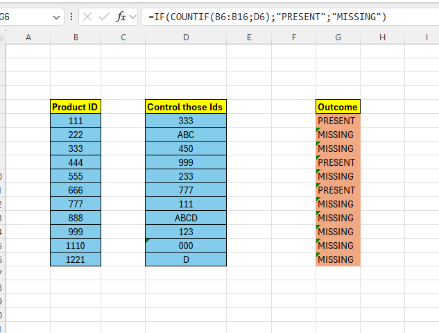 =IF(COUNTIF(B6:B16;D6);”PRESENT”;”MISSING”)