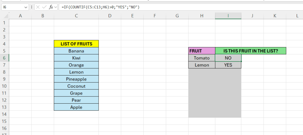 =IF(COUNTIF(C5:C13;H6)>0;”YES”;”NO”)