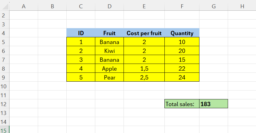 Below we have some fruits, price per fruit, and total quantity. Our goal is to calculate the total sales.
