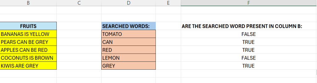 Above in column B, we have a list of sentences. In column D, there is a list of words that we want to search for. In column F we have the result from the formula.