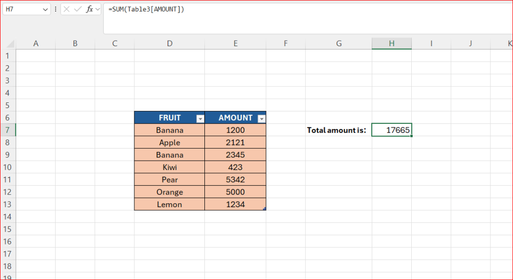 - =SUM(Table1[AMOUNT])