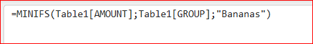 - =MINIFS(Table1[AMOUNT];Table1[GROUP];”Bananas”)
