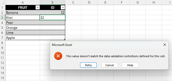 - Select the cells in column B where you want the data validation to apply.