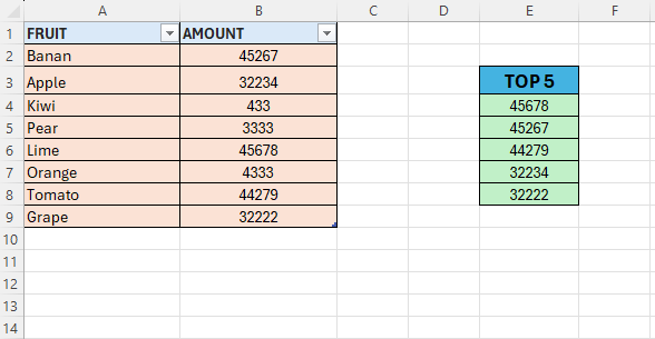 - =LARGE($B$2:$B$9;1)