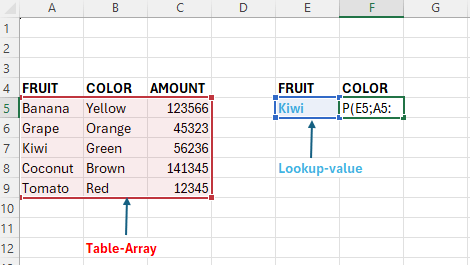 Above we want to return the color for the lookup-value “Kiwi”.